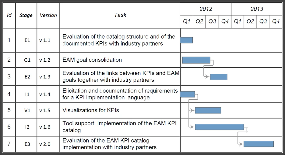 To enable enterprise architects to measure and track their goal achievements, this catalog provides 52 key performance indicators (KPIs) discovered and applied in industry projects or documented in relevant literature.