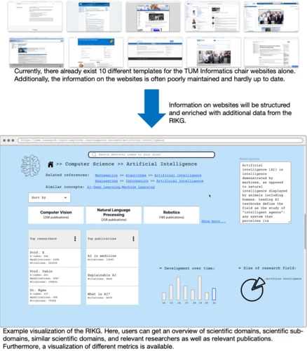 To address the issues mentioned above, this project aims at developing a Knowledge Graph based framework that links semantically related scientific domains of research institutions, called Research Institution Knowledge Graph (RIKG). This will enhance the exploration of research areas studied in research institutions and provide an overview of their quality and quantity. Furthermore, in research institutions not only research areas are important but especially the people working on different research topics. Therefore, to enable researchers to identify other relevant researchers from a scientific domain within a research institution, the RIKG will link institution members to scientific domains. In addition, the RIKG computes the relevance of people to scientific domains at research institutions using a variety of metrics.