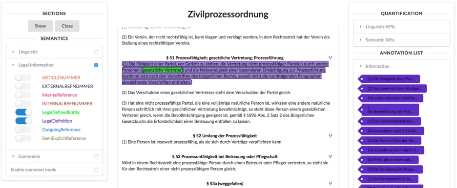 - What is an appropriate analysis of German legal texts in order to support the semantic search and interpretation?