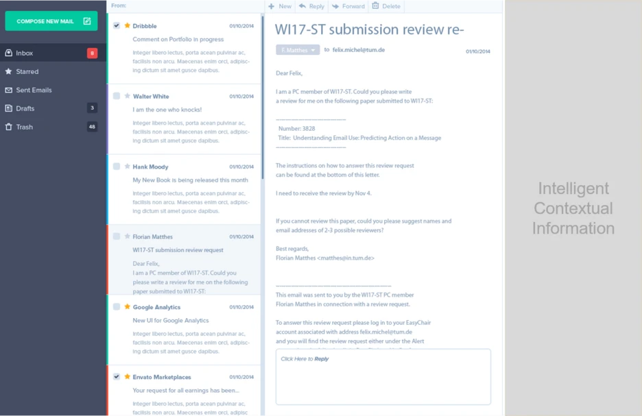 Emails are the most common communication medium to communicate across enterprise boarders. Most email boxes contain a lot of knowledge, nevertheless the seamless integration to knowledge management tools lacks. The objective of this project is to provide intelligent contextual information related to emails and link them e.g. to task in third party systems and keep track of the progress.