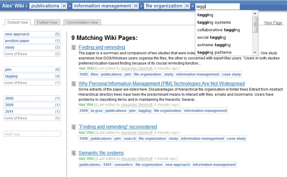 - A faceted search interface was developed to browse the contents of wikis. With this extension, users do not have to create hierarchical menu structures to browse wiki contents, but the tags assigned to these pages are used to provide faceted navigation options. This way, a list of pages can for instance be filtered by year as well as by project name given that such tags are used in the wiki.